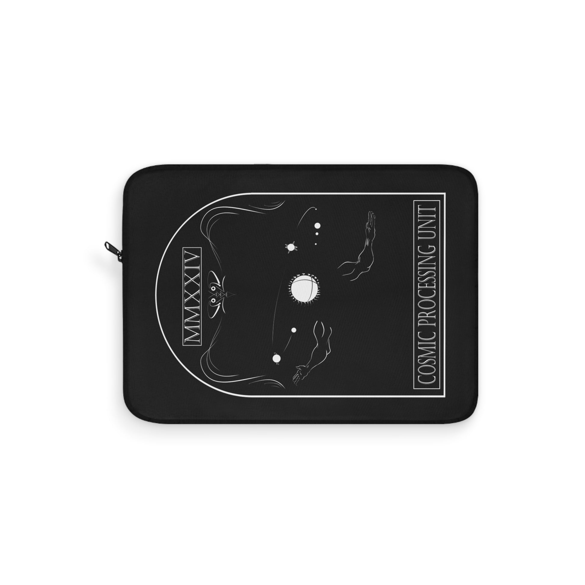 Embody the cosmic fusion of technology and mysticism with our "Cosmic Processing Unit" laptop sleeve, featuring a mesmerizing design that depicts a celestial being balancing a galaxy's revolution with outstreatched arms and a radiant, sun-like planetary head. This Glitch Gothica themed artwork is perfect for fans of sci-fi, space, futuristic, and goth fashion. It's sure to propel your style into orbit.