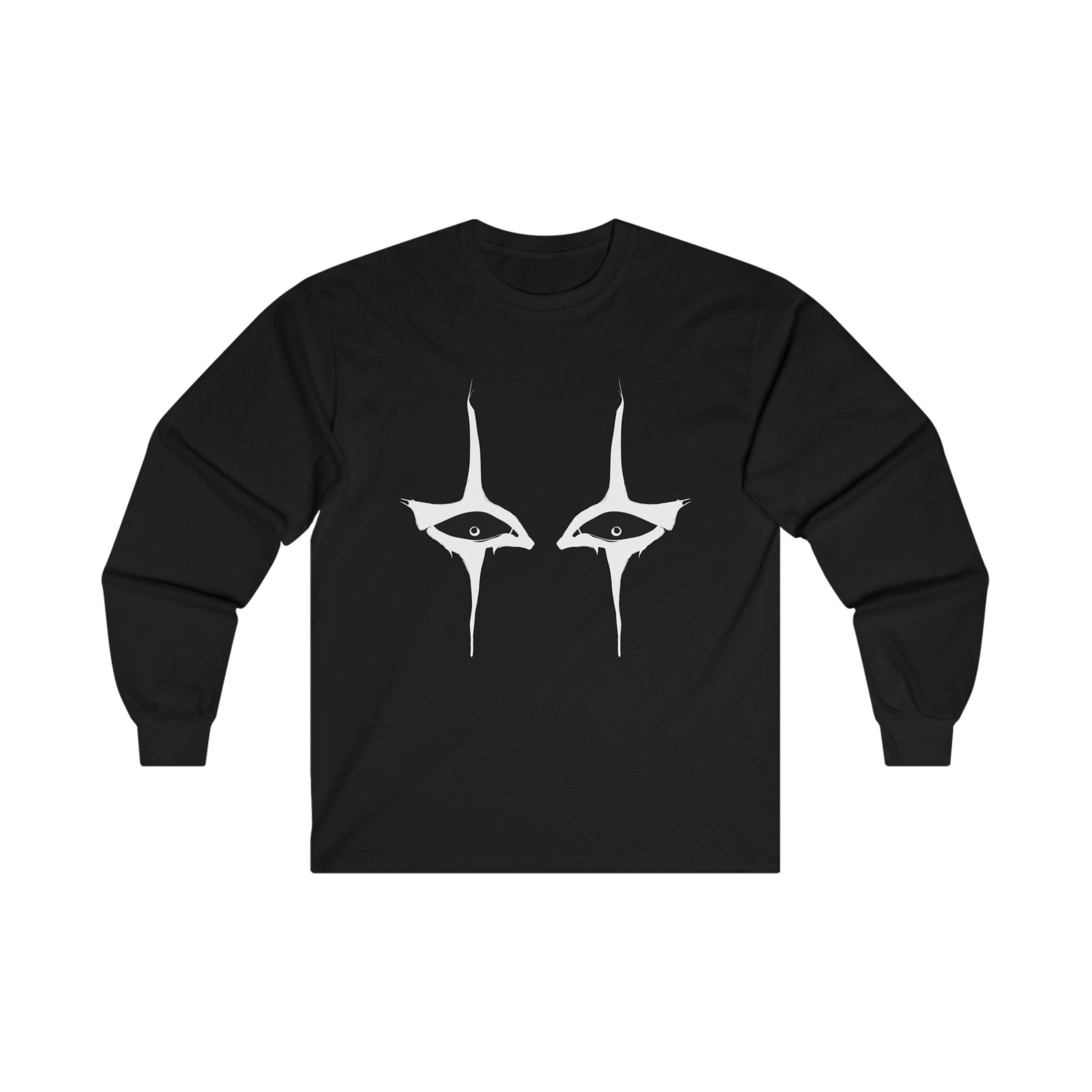 Peer into the abyss with our "Inverted Gaze" themed long sleeve tee, featuring a mesmerizing design that plunges you into the depths of the unknown. This striking symmetrical artwork depicts a pair of eyes shrouded in black metal paint, inverted to create an unsettling, ghostly stare that will leave onlookers entranced. The cotton used for these shirts is environmentally friendly.