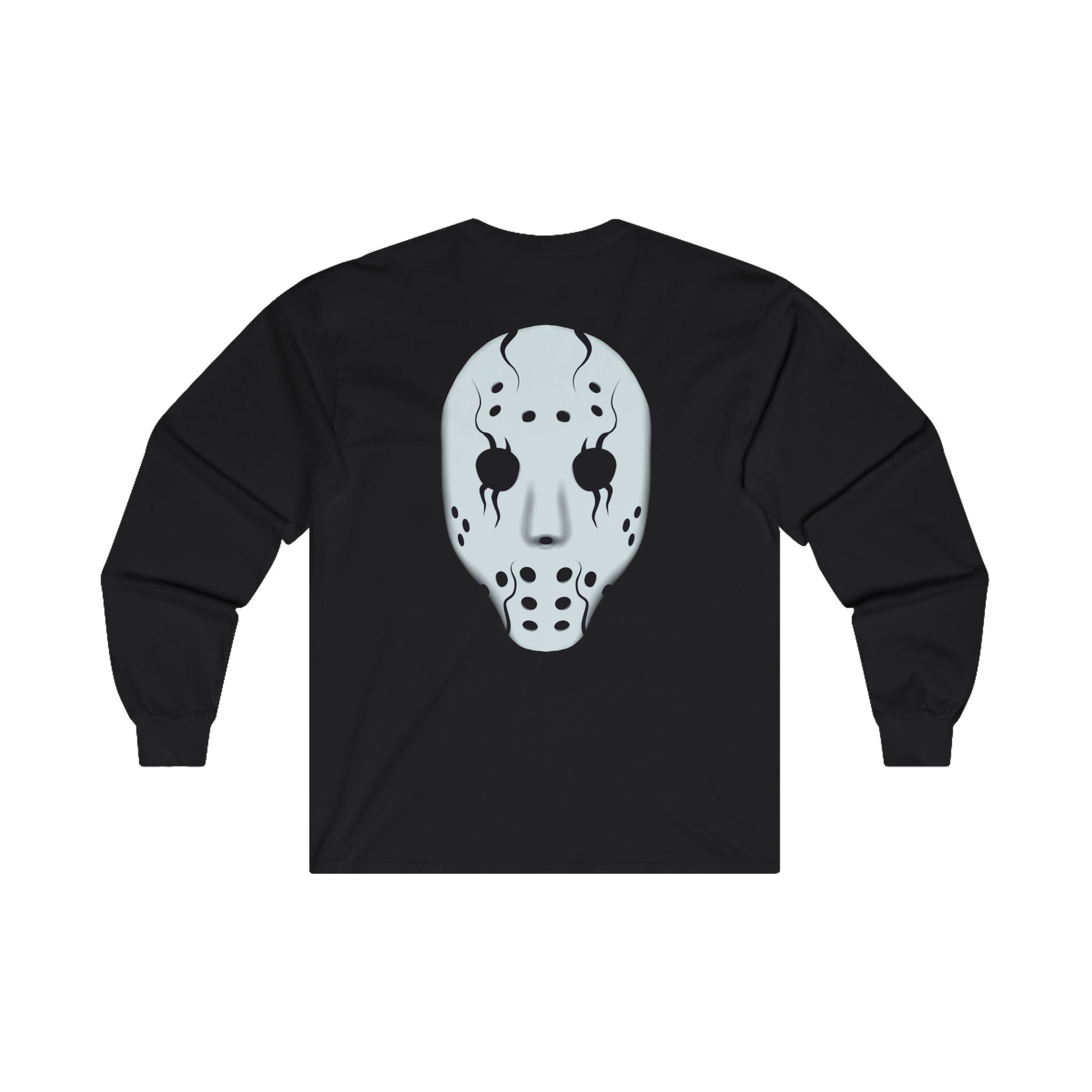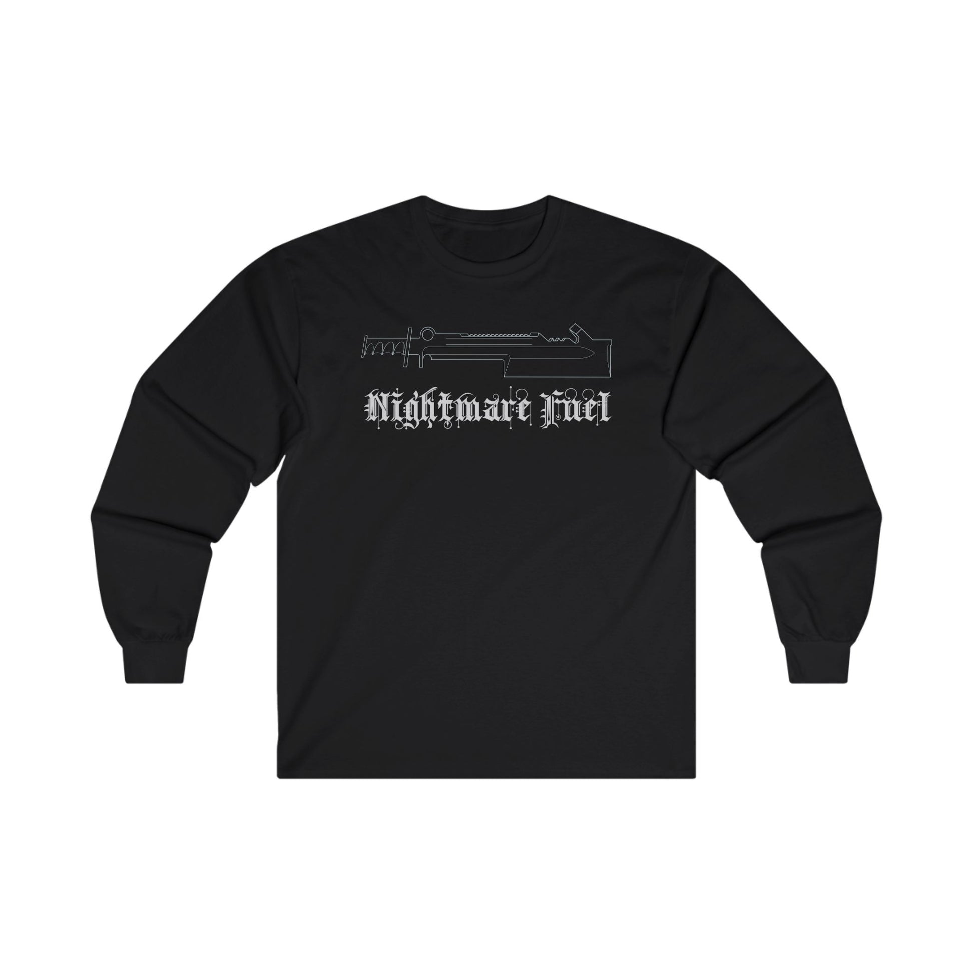 Unleash your inner horror fan with this edgy and stylish long sleeve tee. Featuring a menacing hockey mask inspired by a classic slasher film (you know the one), adorned with black metal face paint on the back, and a futuristic sleek white machete outline on the front, this long sleeve shirt is a must-have for those who dare to embrace the dark side. The "Nightmare Fuel" caption adds a touch of rebellious attitude. Perfect for Halloween, cosplay, or everyday wear, this shirt is guaranteed to turn heads and spark conversations.